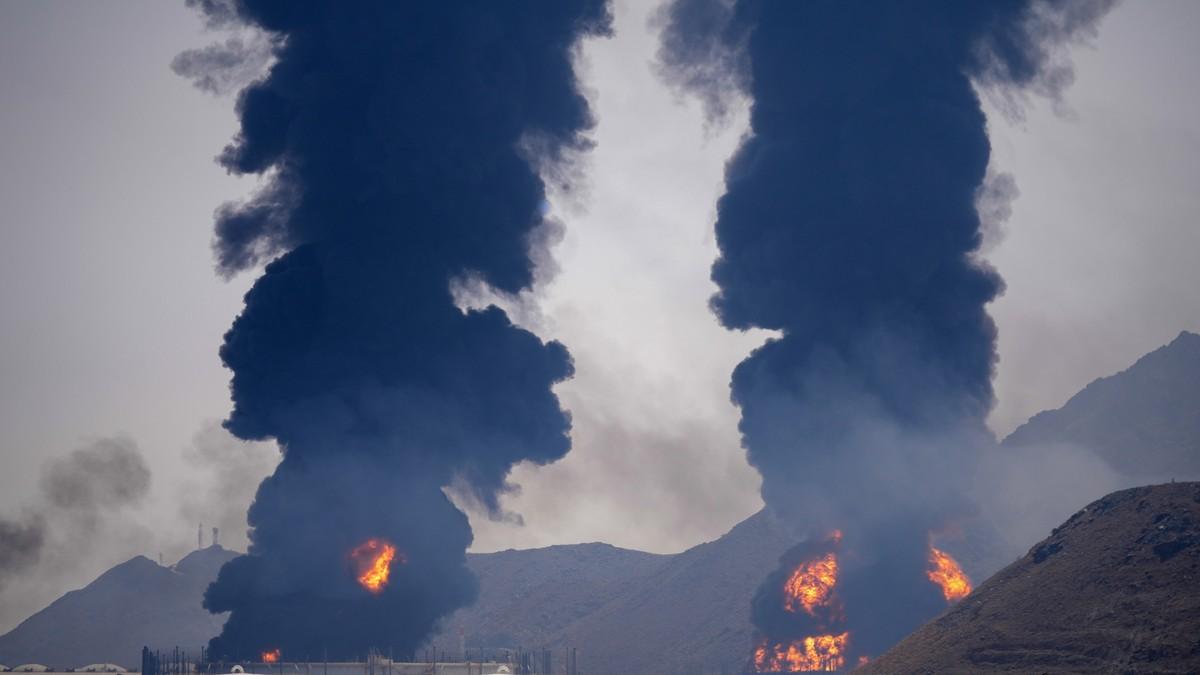 Požar nakon što je otpad od presretnutog iranskog drona pogodio naftno postrojenje u Fudžajrahu u Emiratima 14. marta (Foto: Altaf Qadri, File / Tanjug/AP)