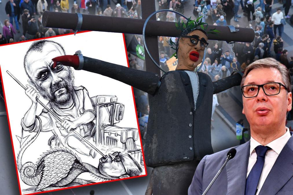 Za samo četiri dana predsedniku Srbije upućene su četiri jezive, monstruozne pretnje u kojima blokaderi prizivaju njegovu ili smrt nekog od članove predsednikove porodice, a u poslednje vreme preovlađuju morbidni preformansi poput onog na blokaderskom skupu u Nišu kada je na krstu razapeta lutka sa Vučićevim likom ili sramne karikature koju je na Fejsbuku objavila blokaderka Ljiljana Bralović, a na kojoj blokader Zlatko Kokanović probada kopljem predsednika države! Ta karikatura takođe predstavlja aluzuju na ikonu na kojoj Sveti Đorđe (Georgije) ubija aždaju!