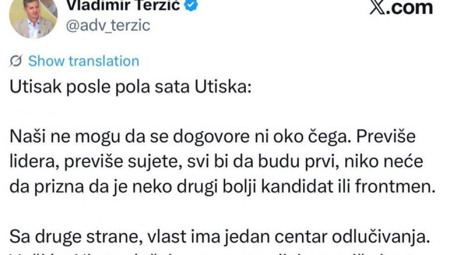 BLOKADERSKI advokat i pajtos Save Manojlovića, Vladimir Terzić, pao je u očaj tokom emitovanja Utiska nedelje.
