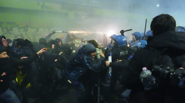 Када је колона стигла до улице Марокети, група маскираних демонстраната обучених у црно почела је да баца бакље и флаше на припаднике полиције и карабињере, што је изазвало реакцију снага безбедности.