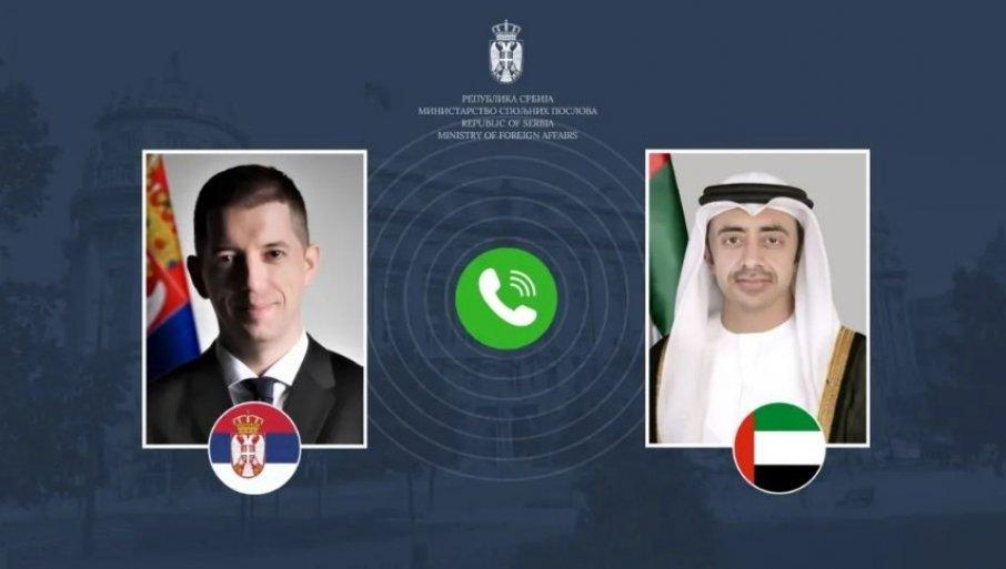 MINISTAR spoljnih poslova Marko Đurić je danas razgovarao sa ministrom spoljnih poslova Ujedinjenih Arapskih Emirata šeikom Abdulom bin Zajedom Al Nahjanom.