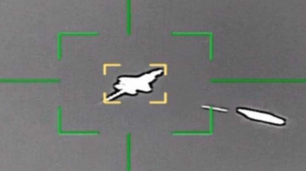 Беличаста силуета, необично налик авиону Ф-35, летела је све док је није пресрео једнако јарки траг пројектила. Уследила је експлозија, после које је шест секунди дуг снимак прекинут.