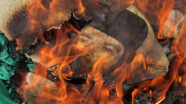Док су његово тело прекривали земљом, хиљаде Либијаца узвикивале су слогане из времена владавине Моамера Гадафија, подизале фотографије убијеног и махале старим, зеленим заставама ове државе.