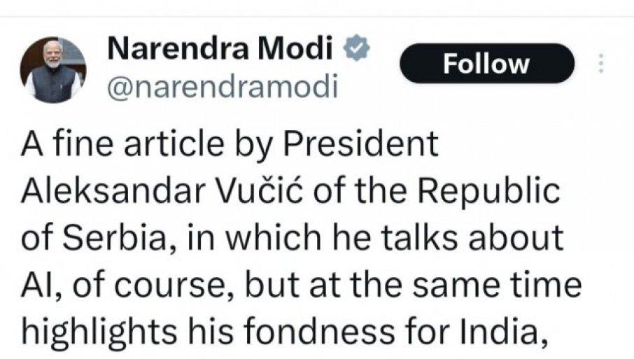 PREDSEDNIK Indije Narendra Modi podelio je tekst predsednika Srbije Aleksandra Vučića na mreži X.