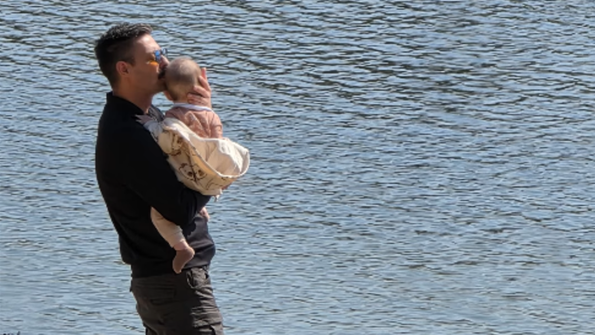 Milan je pozirao pored vode i u naručju držao Despota kojeg je ljubio u glavu.